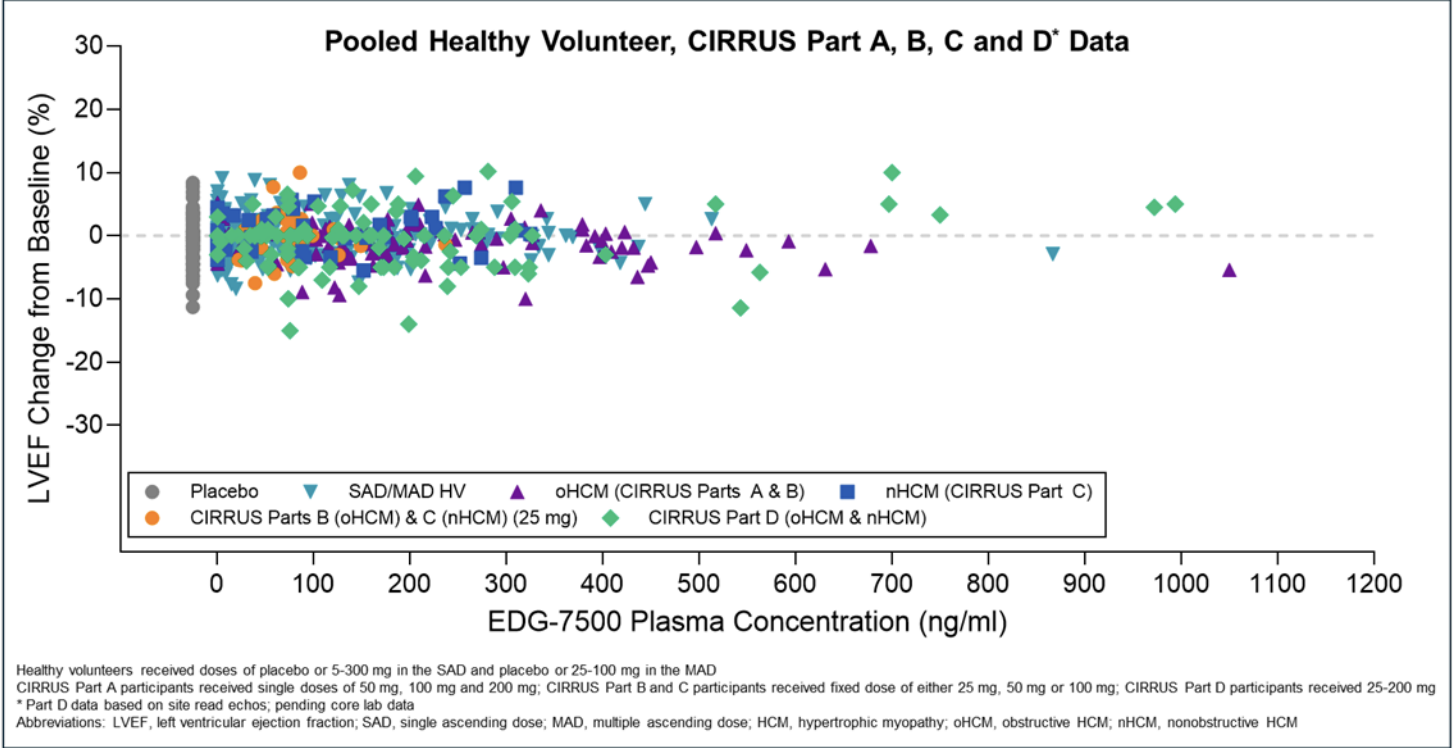 In this interim safety update, for the 20 participants who completed 12 weeks of dosing in Part D as of the data cutoff date (8 with oHCM and 12 with nHCM), EDG-7500 generally had a favorable safety profile and was well tolerated. Consistent with previous observations, no clinically significant changes in LVEF or reductions in LVEF to below 50% were observed, with EDG-7500 continuing to demonstrate a differentiated LVEF profile relative to CMIs. The safety profile observed with EDG-7500 to date, across both healthy volunteers and the CIRRUS-HCM trial, supports the potential use of EDG-7500 in diverse HCM patient populations. Unlike CMIs, which have a mechanism of action that has been associated with a risk of systolic dysfunction and an increased risk of heart failure, EDG-7500 administration continues to present no meaningful effect on LVEF. Preservation of systolic function has the potential to avoid the patient safety monitoring burden that could limit CMI adoption outside of HCM centers of excellence, which could expand prescriber reach and patient access, if approved.